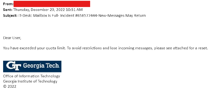 - An Office of Information Technology (OIT) message being sent from a user (vs. their dedicated it@gatech.edu address or support@oit.gatech.edu address)