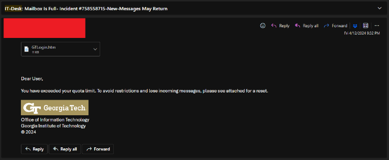 GTLogin.htmattachment. - Upon doing so, students submit their credentials to a malicious third-party, getting redirected several times until arriving at the
