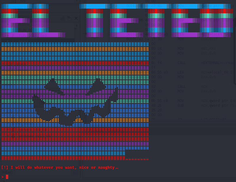 printstr("[!] I will do whatever you want, nice or naughty..\n\n> ");