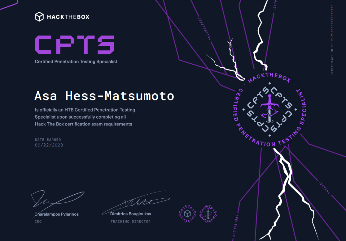 The journey towards attaining my CPTS certification broadened my offensive capabilities, made me better at my job, and had me re-evaluate what I thought I knew. It was a phenomenal introduction to penetration testing techniques and best practices and a great learning opportunity overall.