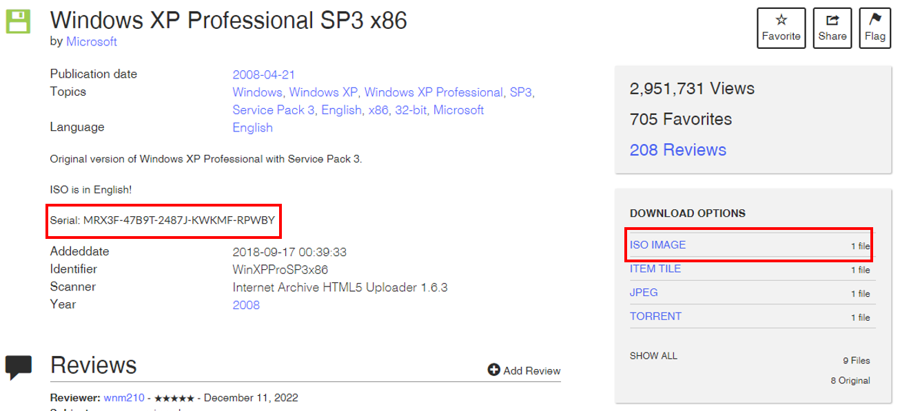 Through Google and other searches, I found an archived copy of Windows XP stored here. We’ll be downloading the *.ISO file. Note the Serial key that’s listed: