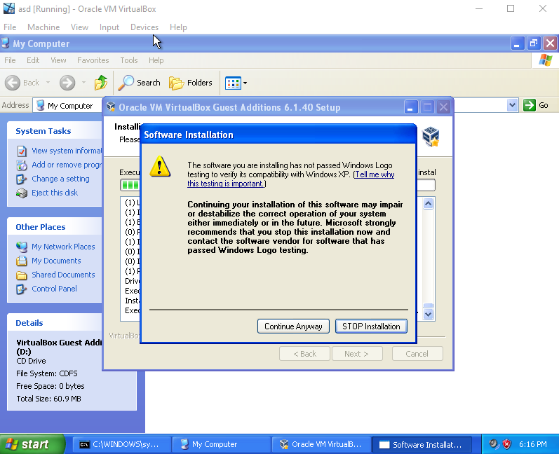 The version of Internet Explorer that ships with Windows XP is so old that it can’t really browse the modern internet with TLS/SSL. To that end, we’re first going to install Virtualbox’s guest tools by select the Devices dropdown menu, then Insert Guest Additions CD. Navigating to My Computer will then show the tools ready to be run as Virtualbox Guest Additions: